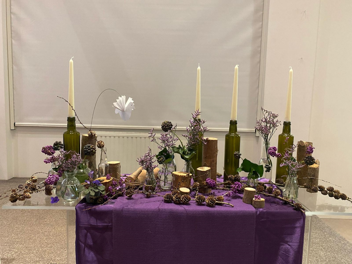 ‘Kijk! Laat je verrassen door het werk van Gods Geest.’ Advent is een tijd van verwachting en hoop. En een tijd van actief kijken en ontdekken. Kijk! Laat je verrassen door het werk van Gods Geest. In de schikking wordt het zichtbaar doordat door de weken heen een beweging van donker naar licht zichtbaar wordt. Vier adventskaarsen vormen de basis. Daaromheen staan boomstammetjes en glazen flesjes. Tussen de kaarsen komen duifjes (als symbool van Gods Geest) en engeltjes (als boodschappers van Gods Geest) te hangen. Lees verder |