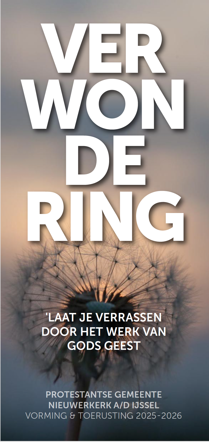 Voor u ligt weer een jaarfolder met verschillende manieren om met dit thema aan de slag te gaan. Verwonder je bij een mooie film, een voorstelling, muziek, of duik in een goed boek van onze boekenmarkt. Zoek even de stilte op bij een meditatiemoment. Ga eens de tuin in met Ruud en verwonder je over wat er groeit. Ga mee op pad en ontdek een wonderlijk heiligenverhaal. Laat je kijk op dingen verruimen in een gesprek dat een spade dieper gaat. Ook kinderen en jongeren worden uitgenodigd om eens verder te kijken dan hun neus lang is. Kortom, voor iedereen is er weer genoeg te doen en te beleven. Of je nu een vaste gast bent in onze kerk of zomaar eens een keer om de hoek komt, stap gerust eens binnen! Taakgroep Vorming & Toerusting, ds. Laura Nagelkerke |