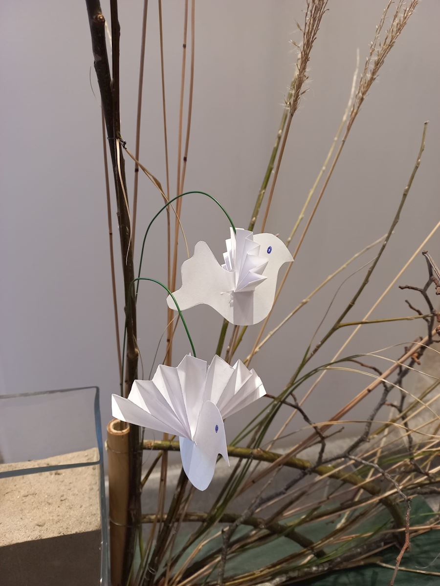 16 feb 2026 Veertigdagentijd, Stille week en Pasen 2026 De Geest Waaiert breed uitDe Geest waaiert breed uit wordt in de schikking verbeeld door een waaier en duifjes. De waaier staat voor beweging en communicatie op weg naar een andere toekomst, een nieuw begin. In de loop van de weken wordt de schikking steeds groener. De duifjes zijn het symbool van de Heilige Geest. | ||