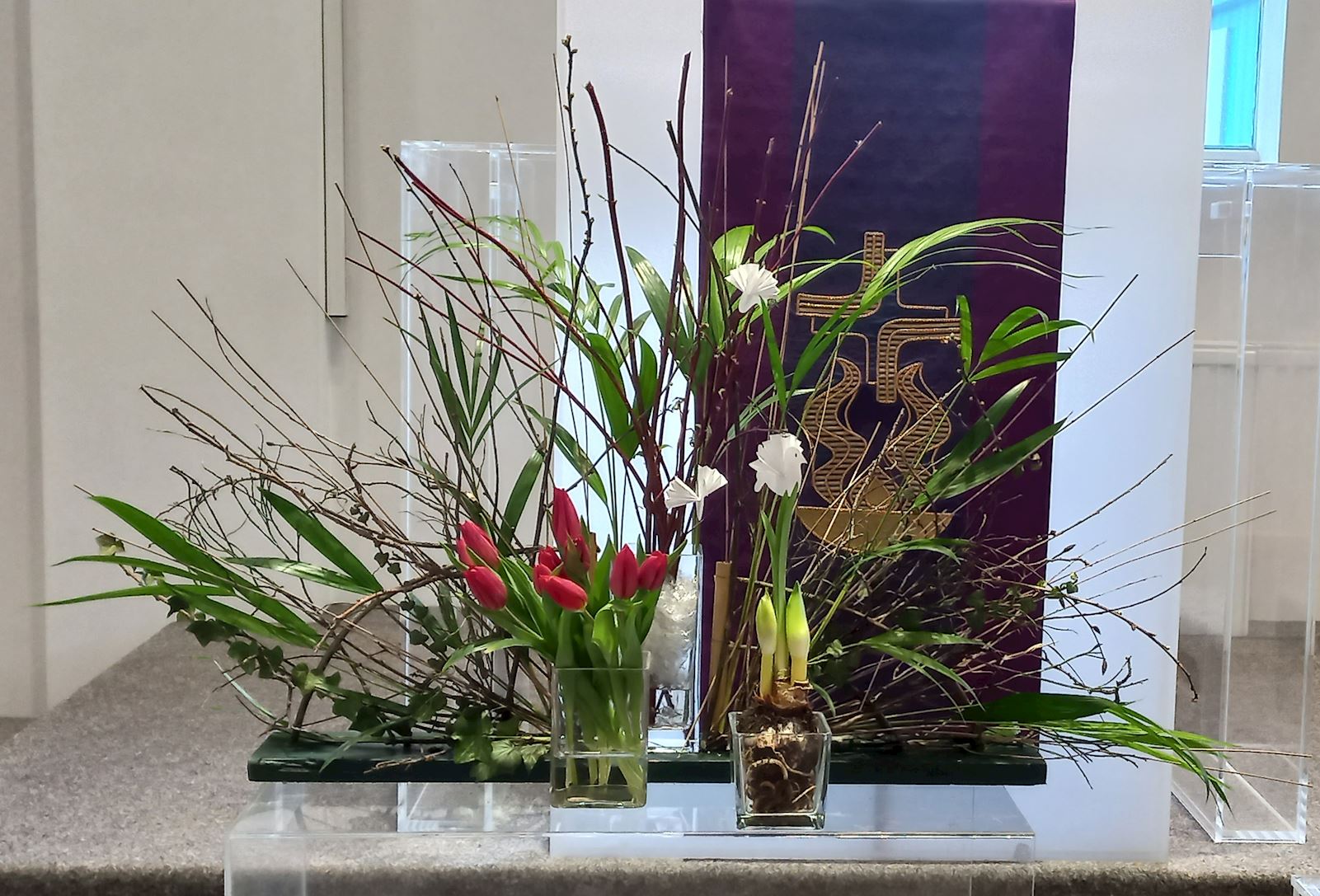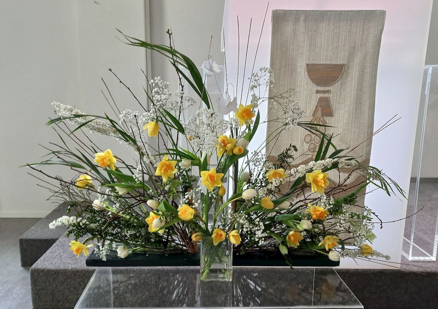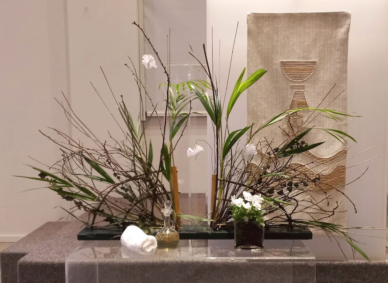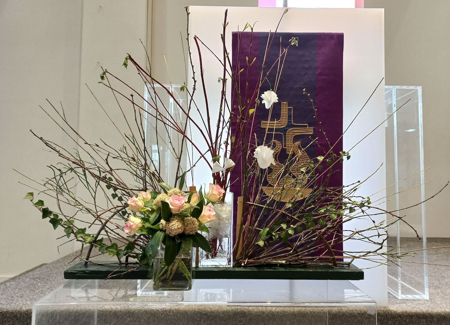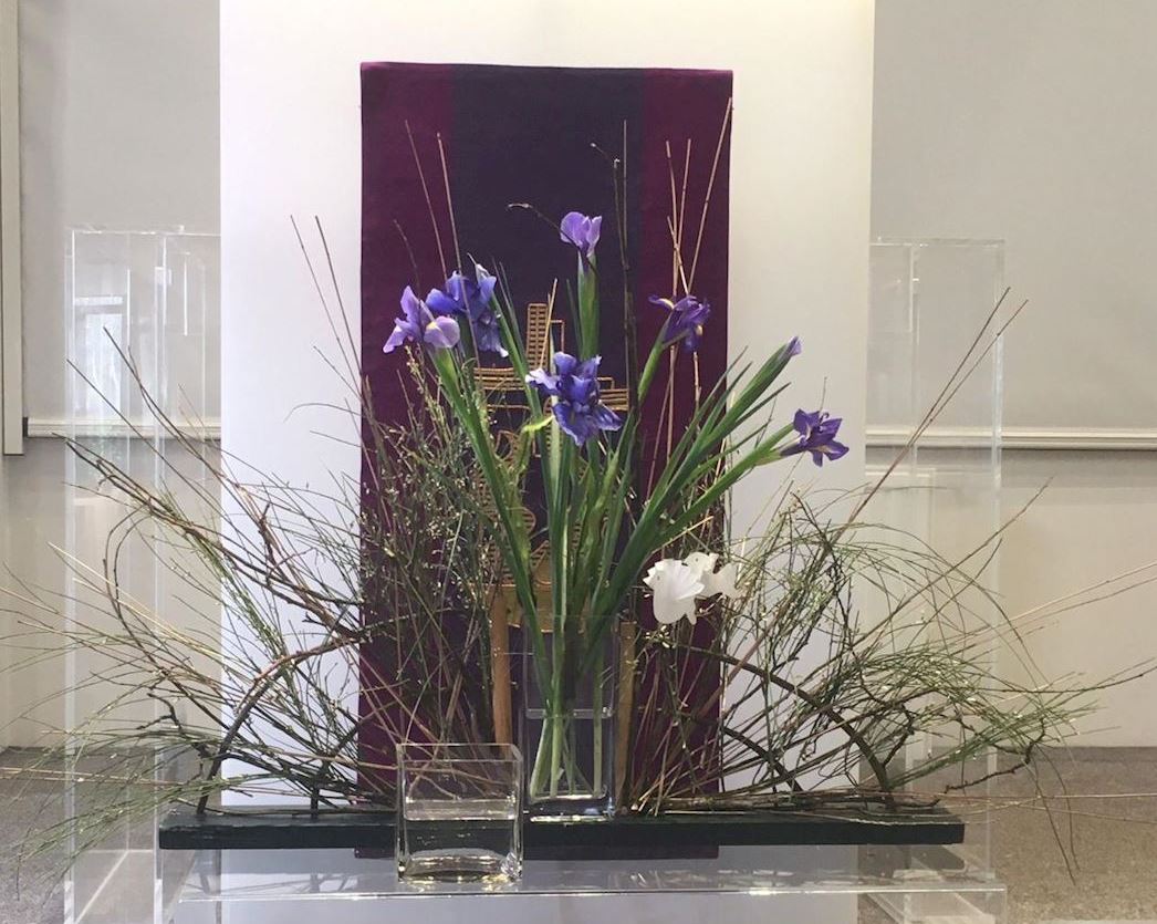 16 feb 2026 Veertigdagentijd, Stille week en Pasen 2026 1e zondag 22 februari 2026Lezing: Matteüs 4, 1-11 Kernvers: Daarna werd Jezus door de Geest meegevoerd naar de woestijn. De grote vaas is gevuld met droog zand als symbool voor de woestijn. Paarse bloemen verbeelden de liturgische kleur. De grassen van vorig seizoen zijn geweven in de waaier als teken van negatieve krachten. In de waaier is de Geest zichtbaar in de vorm van duifjes. ![]() 2e zondag 1 maart 2026 Lezing: Matteüs 17, 1-9 Kernvers: Jezus nam Petrus, Jakobus en diens broer Johannes met zich mee een hoge berg op. In de waaier is de Geest zichtbaar gemaakt met de duifjes. In deze schikking gaat de aandacht naar de metgezellen van Jezus die worden gesymboliseerd door drie witte bloemen. Drie vrienden die zorgen, meedragen met de vriend op diens onbekende weg. De (band)wilg wordt geassocieerd met groeien en vertrouwen. Een wilgentak die je in de grond steekt groeit in korte tijd uit tot een boom. Het zand en de stenen laten iets zien van de berg. ![]() 3e zondag 8 maart 2026 Lezing: Johannes 4, 1-26 Kernvers: Jezus verliet Judea en ging weer naar Galilea. Daarvoor moest hij door Samaria heen. De vaas tussen de waaier is gevuld met water en irissen. In de andere vaas zit water als verwijzing naar de bron. De iris (viooltje) is driekleurig en is een drietallige bloem, een verwijzing naar de Vader, de Zoon en de heilige Geest. De kleuren van iris zijn blauw, wit en geel. Blauw - de kleur van de lucht, de hemel en het water; wit – de kleur van de onschuld en geel - de kleur van het goddelijke. ![]() 4e zondag 15 maart 2026 Lezing: Johannes 9, 1-13, 26-39 Kernvers: Zolang Ik in de wereld ben, ben Ik het licht voor de wereld. Met de witte bloeiende bloesemtakken wordt het werk van God zichtbaar gemaakt. In de bloesemtakken hangen ook de duifjes als symbool van de Geest. Voor de schikking staat een witte kaars als teken voor het licht van de wereld. ![]() 5e zondag 22 maart 2026 Lezing: Johannes 11, 1-4, 17-44 Kernvers: Jezus zei: ‘Ik ben de opstanding en het leven. Wie in Mij gelooft zal leven.’ In de vaas in de waaier staan rode kornoelje takken in de kleur van liefde. Bewogenheid, zorg voor elkaar en zorg om elkaar, daar gaat dit verhaal over. Handelen uit bewogenheid is als handelen uit liefde, het goede willen doen. In de takken hangen ook weer de duifjes als teken van de aanwezigheid van de Geest. Alle roze bloemen laten zien dat het licht van Pasen langzaam doorbreekt. De sierlijke bloemen van het gebroken hartje lijken op verdriet en vreugdetranen. De geurende bloeiende bloemen van de skimmia versterken de onverwachte vreugde. ![]() 6e zondag 29 maart 2026 Palmpasen Lezing: Matteüs 21,1-11 Kernvers: Hosanna voor de Zoon van David. Gezegend Hij die komt in de naam van de Heer. Ook vandaag speelt de liefde van de Geest een belangrijke rol. De rode Kornoelje takken en de duifjes zijn nog steeds te zien in de schikking. De hoop wordt verbeeld in bloembollen, teken van de komende lente en in de groene kleur. Groen is de kleur voor een goede toekomst. De palmbladeren en rode bloemen zijn het teken van de feestelijke intocht. ![]() Witte donderdag 2 april 2026 Lezing: Matteus 26, 1-30 Bij de waaier met de duifjes als teken van de Geest die breed uit waaiert staat een kruikje met olie als verwijzing naar de zalving. Het witte viooltje wordt geassocieerd met de drie-eenheid vanwege de drie kleuren die erin zichtbaar zijn. ![]() Goede Vrijdag 3 april 2026 Lezing: Matteus 26, 30-69 en Matteus 27, 1-66 Doornentakken in de waaier staan symbool voor de kruisiging en het lijden. De vijf rode anemonen symboliseren druppels bloed, het lijden van Jezus. ![]() Stille Zaterdag 4 april 2026 Lezing: Matteus 28, 1-10 De Geest lijkt verdwenen; de waaier en de duifjes zijn weg. Het enige dat zichtbaar is, is het kruis. ![]() Pasen 5 april 2026 Lezing: De Geest waaiert heel breed uit. De waaier en de vaas zijn gevuld met feestelijke witte en gele bloemen. De narcis symboliseer daarbij het nieuwe leven, de lente. Ook de duifjes zijn goed zichtbaar. | ||