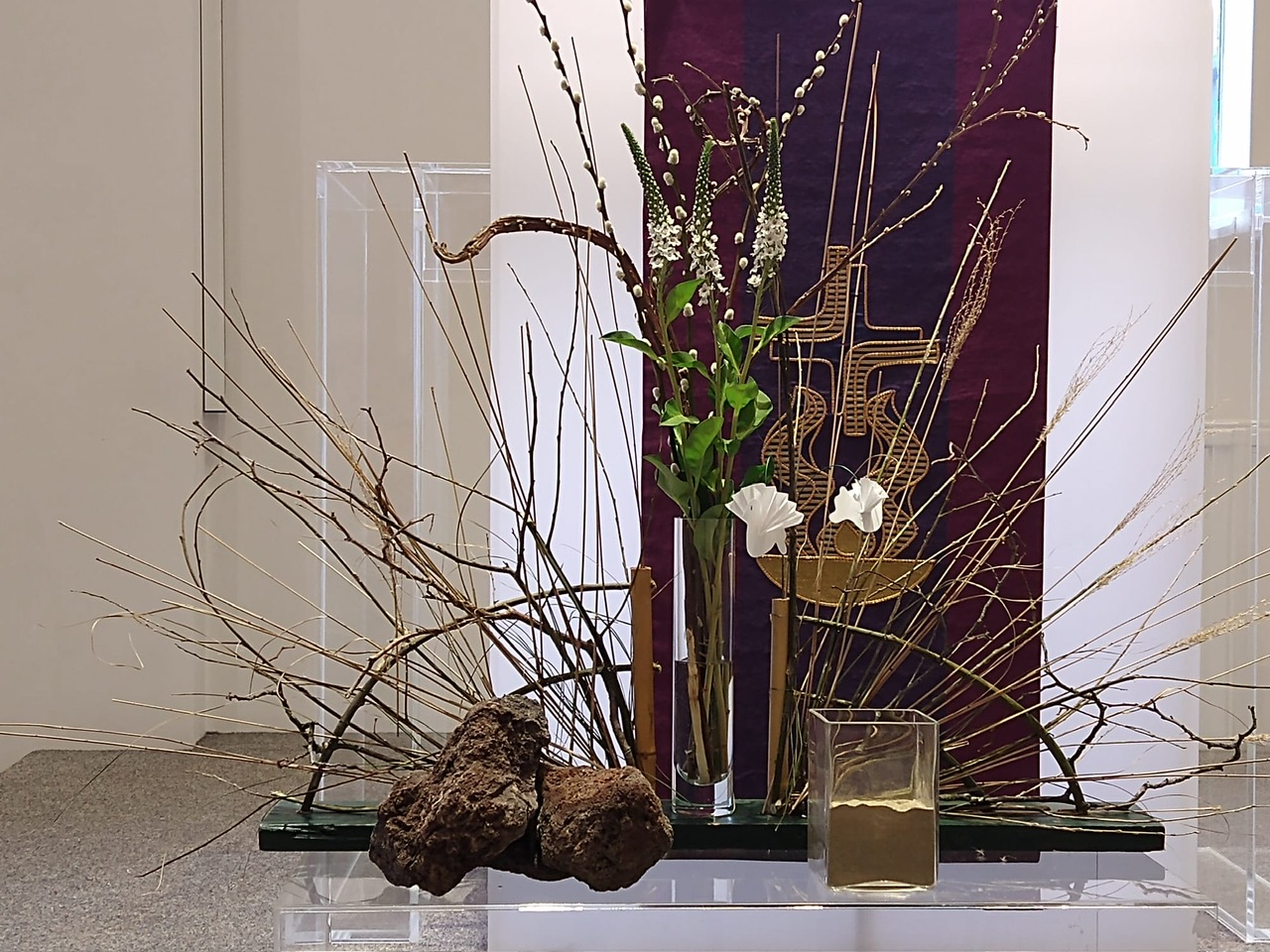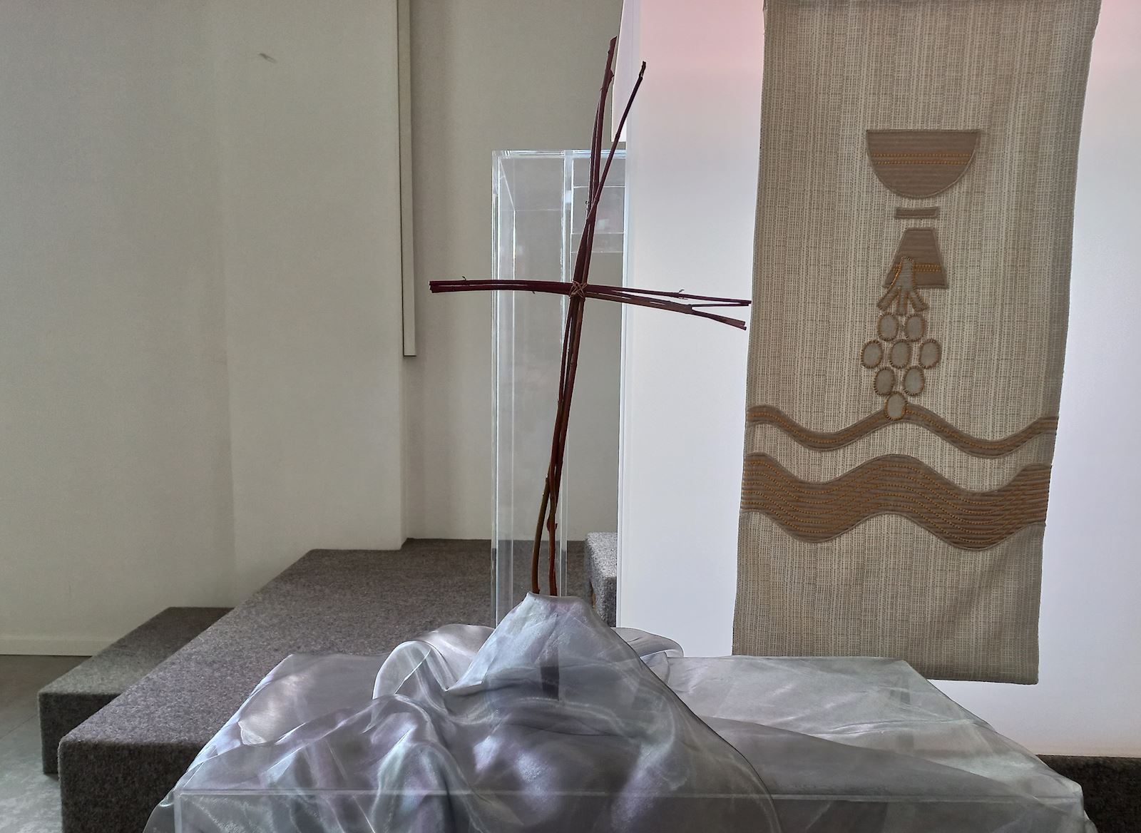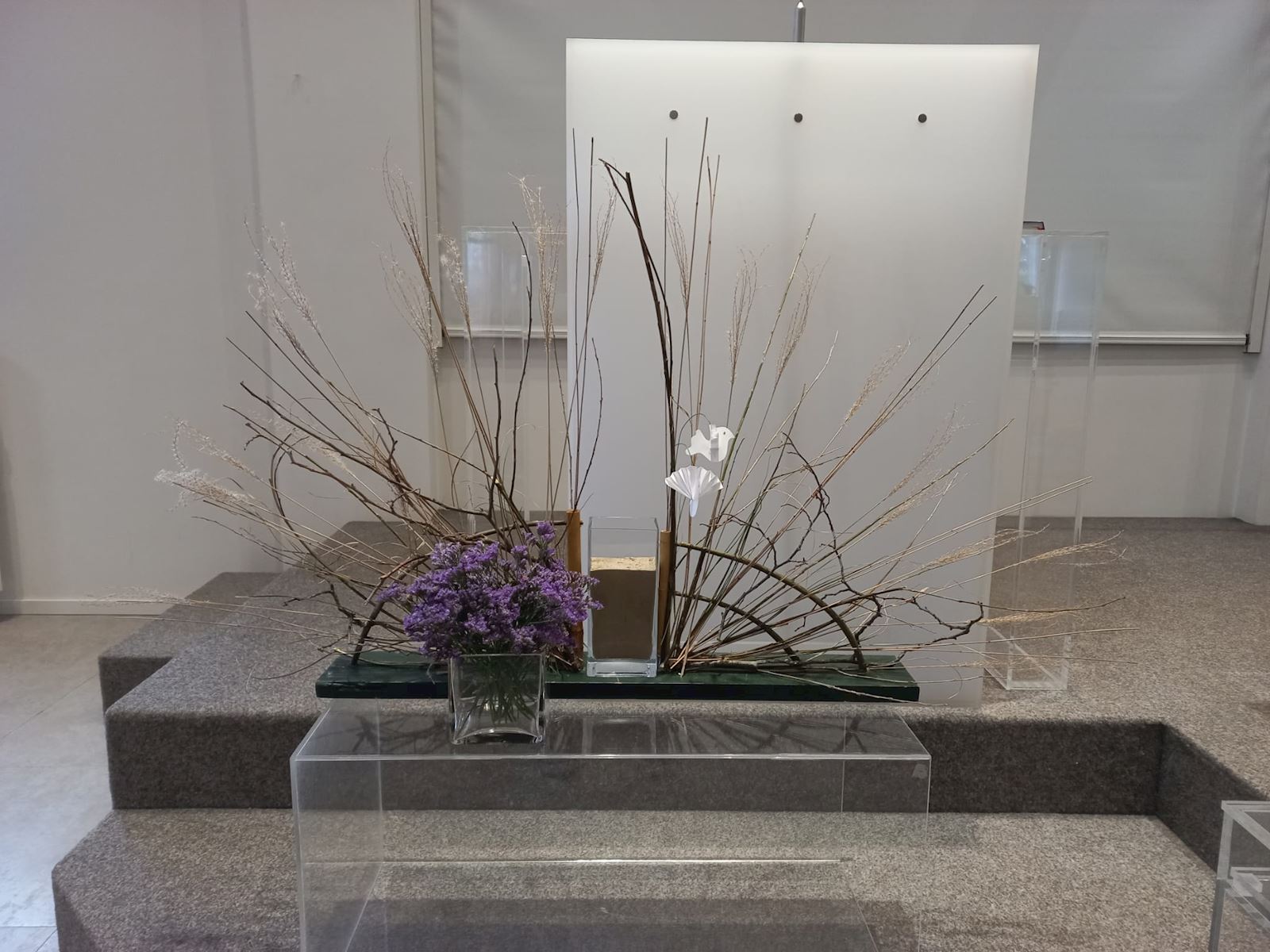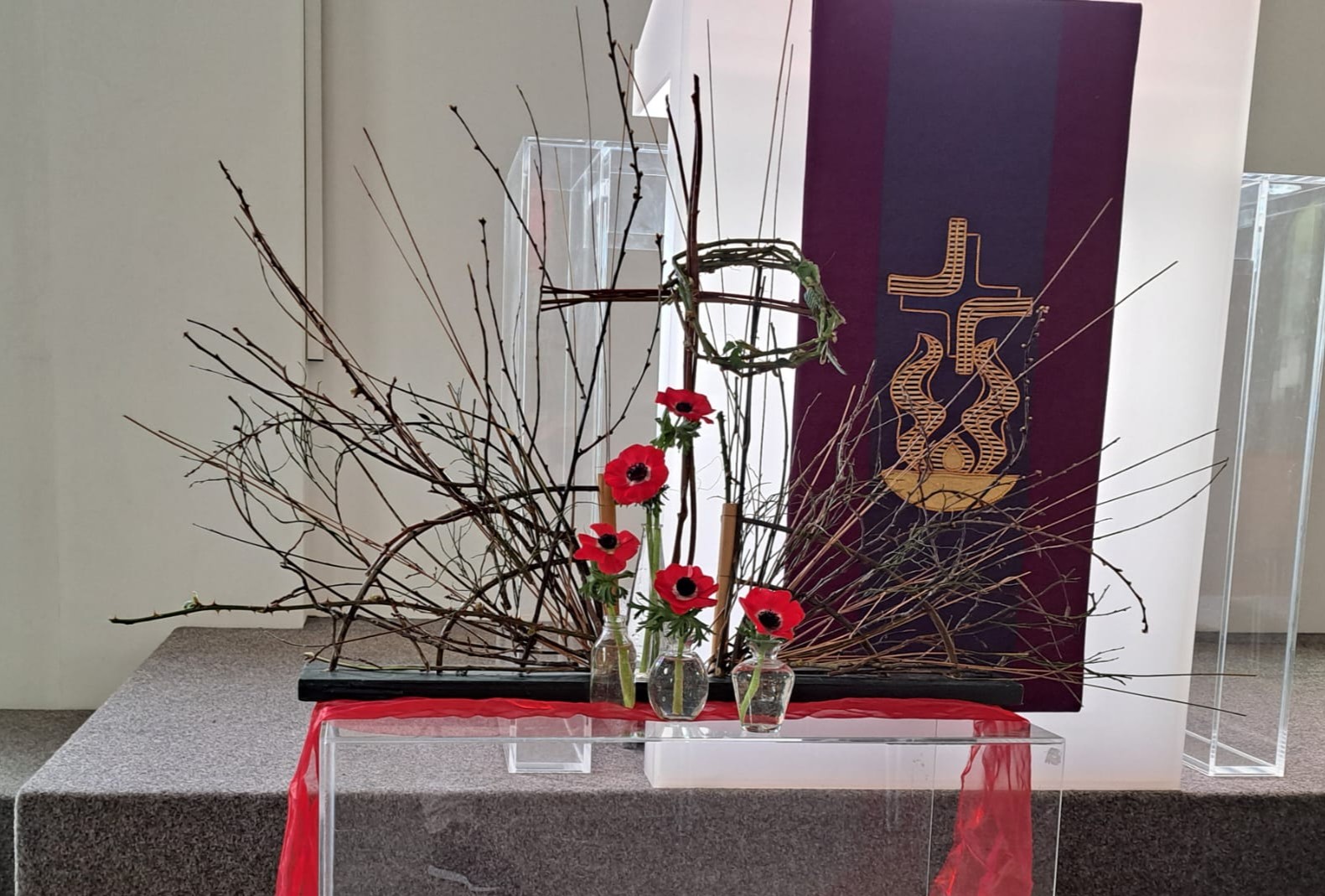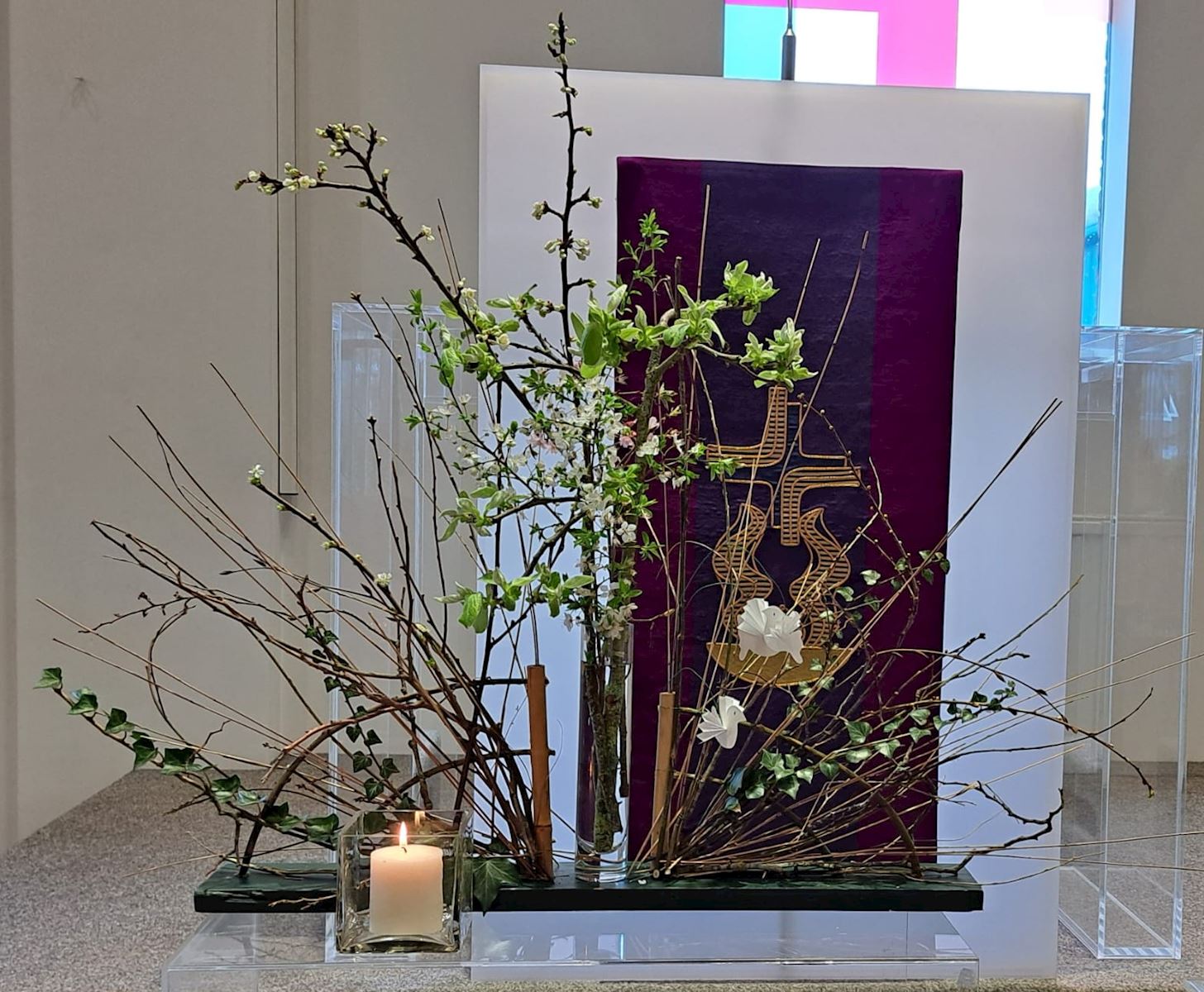 16 feb 2026 Veertigdagentijd, Stille week en Pasen 2026 1e zondag 22 februari 2026Lezing: Matteüs 4, 1-11 Kernvers: Daarna werd Jezus door de Geest meegevoerd naar de woestijn. De grote vaas is gevuld met droog zand als symbool voor de woestijn. Paarse bloemen verbeelden de liturgische kleur. De grassen van vorig seizoen zijn geweven in de waaier als teken van negatieve krachten. In de waaier is de Geest zichtbaar in de vorm van duifjes. ![]() 2e zondag 1 maart 2026 Lezing: Matteüs 17, 1-9 Kernvers: Jezus nam Petrus, Jakobus en diens broer Johannes met zich mee een hoge berg op. In de waaier is de Geest zichtbaar gemaakt met de duifjes. In deze schikking gaat de aandacht naar de metgezellen van Jezus die worden gesymboliseerd door drie witte bloemen. Drie vrienden die zorgen, meedragen met de vriend op diens onbekende weg. De (band)wilg wordt geassocieerd met groeien en vertrouwen. Een wilgentak die je in de grond steekt groeit in korte tijd uit tot een boom. Het zand en de stenen laten iets zien van de berg. ![]() 3e zondag 8 maart 2026 Lezing: Johannes 4, 1-26 Kernvers: Jezus verliet Judea en ging weer naar Galilea. Daarvoor moest hij door Samaria heen. De vaas tussen de waaier is gevuld met water en irissen. In de andere vaas zit water als verwijzing naar de bron. De iris (viooltje) is driekleurig en is een drietallige bloem, een verwijzing naar de Vader, de Zoon en de heilige Geest. De kleuren van iris zijn blauw, wit en geel. Blauw - de kleur van de lucht, de hemel en het water; wit – de kleur van de onschuld en geel - de kleur van het goddelijke. ![]() 4e zondag 15 maart 2026 Lezing: Johannes 9, 1-13, 26-39 Kernvers: Zolang Ik in de wereld ben, ben Ik het licht voor de wereld. Met de witte bloeiende bloesemtakken wordt het werk van God zichtbaar gemaakt. In de bloesemtakken hangen ook de duifjes als symbool van de Geest. Voor de schikking staat een witte kaars als teken voor het licht van de wereld. ![]() 5e zondag 22 maart 2026 Lezing: Johannes 11, 1-4, 17-44 Kernvers: Jezus zei: ‘Ik ben de opstanding en het leven. Wie in Mij gelooft zal leven.’ In de vaas in de waaier staan rode kornoelje takken in de kleur van liefde. Bewogenheid, zorg voor elkaar en zorg om elkaar, daar gaat dit verhaal over. Handelen uit bewogenheid is als handelen uit liefde, het goede willen doen. In de takken hangen ook weer de duifjes als teken van de aanwezigheid van de Geest. Alle roze bloemen laten zien dat het licht van Pasen langzaam doorbreekt. De sierlijke bloemen van het gebroken hartje lijken op verdriet en vreugdetranen. De geurende bloeiende bloemen van de skimmia versterken de onverwachte vreugde. ![]() 6e zondag 29 maart 2026 Palmpasen Lezing: Matteüs 21,1-11 Kernvers: Hosanna voor de Zoon van David. Gezegend Hij die komt in de naam van de Heer. Ook vandaag speelt de liefde van de Geest een belangrijke rol. De rode Kornoelje takken en de duifjes zijn nog steeds te zien in de schikking. De hoop wordt verbeeld in bloembollen, teken van de komende lente en in de groene kleur. Groen is de kleur voor een goede toekomst. De palmbladeren en rode bloemen zijn het teken van de feestelijke intocht. ![]() Witte donderdag 2 april 2026 Lezing: Matteus 26, 1-30 Bij de waaier met de duifjes als teken van de Geest die breed uit waaiert staat een kruikje met olie als verwijzing naar de zalving. Het witte viooltje wordt geassocieerd met de drie-eenheid vanwege de drie kleuren die erin zichtbaar zijn. ![]() Goede Vrijdag 3 april 2026 Lezing: Matteus 26, 30-69 en Matteus 27, 1-66 Doornentakken in de waaier staan symbool voor de kruisiging en het lijden. De vijf rode anemonen symboliseren druppels bloed, het lijden van Jezus. ![]() Stille Zaterdag 4 april 2026 Lezing: Matteus 28, 1-10 De Geest lijkt verdwenen; de waaier en de duifjes zijn weg. Het enige dat zichtbaar is, is het kruis. ![]() Pasen 5 april 2026 Lezing: De Geest waaiert heel breed uit. De waaier en de vaas zijn gevuld met feestelijke witte en gele bloemen. De narcis symboliseer daarbij het nieuwe leven, de lente. Ook de duifjes zijn goed zichtbaar. | ||